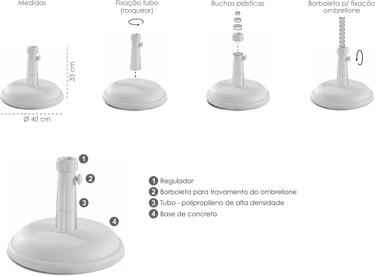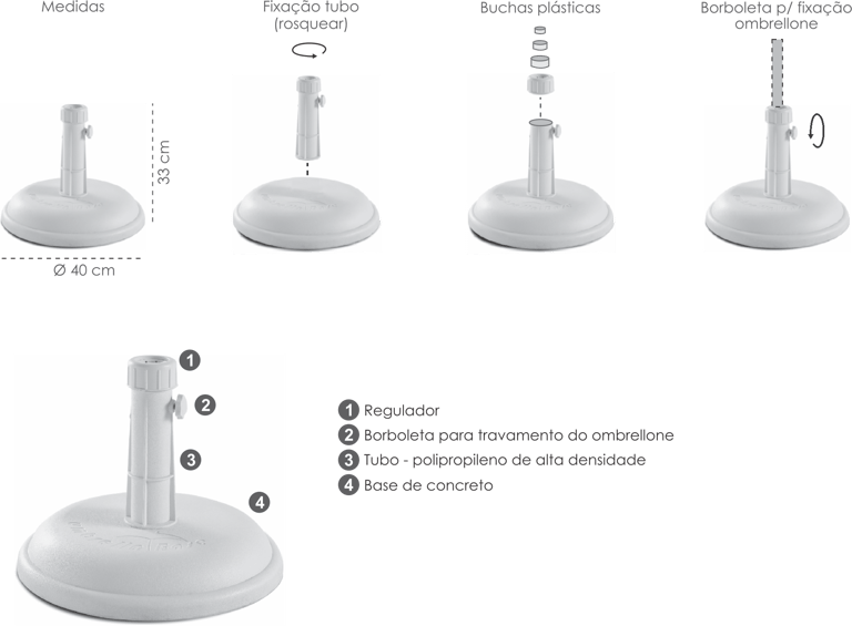 Base concreto expandido pintado e tubo desmontável em polipropileno injetado de alta densidade. Com 3 buchas plásticas para regular o diâmetro interno do tubo, esta base é ideal para guarda-sol e ombrelones de pequeno porte, com tubos de diâmetro até 48mm em locais com incidência de ventos até 20km/h. Fácil de limpar e resistente, este produto traz uma ótima relação custo x benefício e dimensões compactas. Para uma maior vida útil e quando for necessária a mudança de local do ombrelone, aconselhamos não arrastar. Limpeza periódica com água e detergente neutro assegura uma melhor aparência e evita o acúmulo de manchas de difícil remoção.