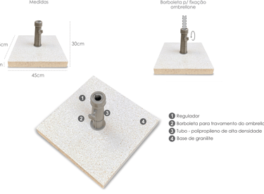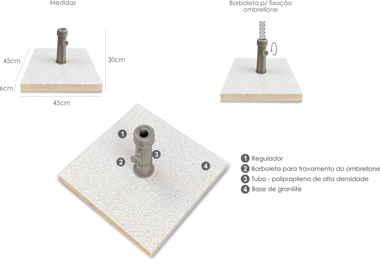 Base em granilite (composição de grânulos de minerais e concreto) e tubo desmontável em polipropileno injetado de alta densidade, acompanha 3 buchas plásticas para regular o diâmetro interno do tubo, esta base é ideal para guarda-sol e ombrelones de pequeno e médio porte, com diâmetro da haste de até 48mm em locais com incidência de ventos até 30km/h. Fácil de limpar e resistente, este produto traz uma ótima relação custo x benefício e dimensões compactas. Para uma maior vida útil e quando for necessária a mudança de local do ombrelone, aconselhamos não arrastar. Limpeza periódica com água e detergente neutro assegura uma melhor aparência e evita o acúmulo de manchas de difícil remoção.