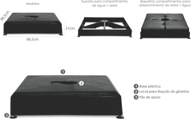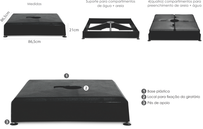 Base plástica desmontável indicada para os ombrelones Sombrano 3x3m, 3,5x3,5m, ø3,5m e ø4m, Treasure Garden sem led 3x3m e 3,5x3,5m, Sirius 3x3m e ø3,5m, Treasure Garden LED 3,5x3,5m e ø4m, Fortano 3x3m e 4x3m. Tampa plástica removível permite encher a base de forma simples e rápida. Recomendamos utilizar areia+água para formar uma massa sólida e consistente, assegurando ainda mais estabilidade. Para uma maior vida útil e quando for necessária a mudança de local do ombrelone, aconselhamos não arrastar a base sem rodinhas. A limpeza periódica com água e detergente neutro assegura uma melhor aparência e evita o acúmulo de manchas de difícil remoção.