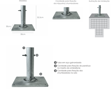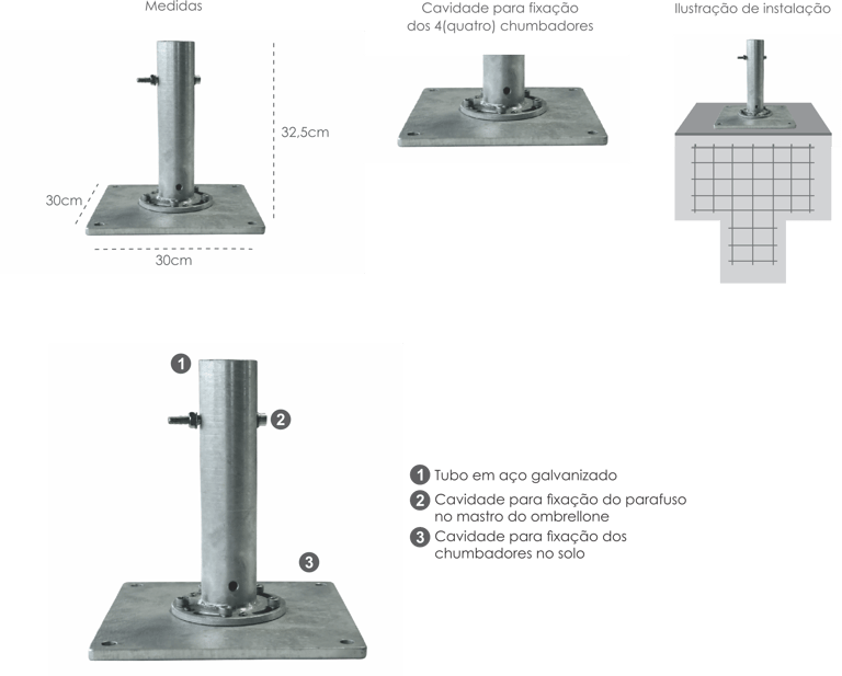 Base fixa para ombrelone central produzida em aço galvanizado altamente resistente, especialmente desenvolvida para proporcionar todo o suporte e sustentação que o ombrelone de grande porte como o Castello necessita. É ideal para locais com incidência de ventos de até 50km/h.