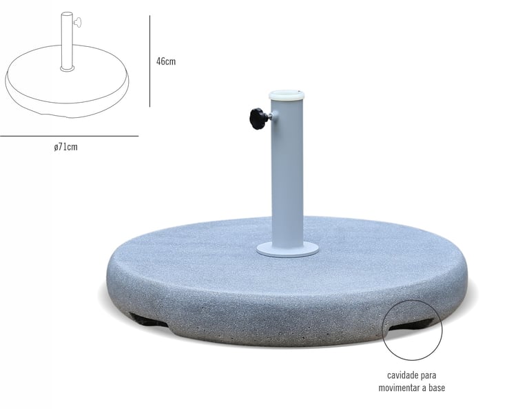 Base em granilite (composição de grânulos de minerais e concreto) e tubo em alumínio com pintura eletrostática, ideal para ombrelones de grande porte, em locais com incidência de ventos até 40km/h. Moderna, bonita e funcional, possui três cavidades para facilitar o manuseio e transporte. Seu tubo possui uma borboleta de travamento e buchas para fixação do mastro do ombrelone. Para uma maior vida útil e quando for necessária a mudança de local do ombrelone, aconselhamos não arrastar a base. A limpeza periódica com água e detergente neutro assegura uma melhor aparência e evita o acúmulo de manchas de difícil remoção.