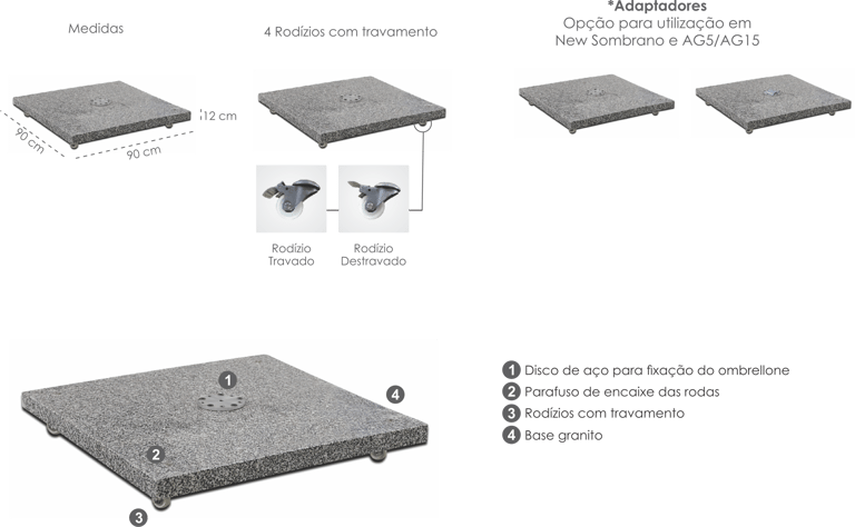 Base em granito e disco para encaixe do ombrelone, ideal para ombrelones de grande porte, em locais com incidência de ventos até 40km/h. Resistente e prática, possui 4(quatro) rodízios com travamento para facilitar o manuseio e transporte. Disco adaptador, altamente resistente para fixação do ombrelone na base.