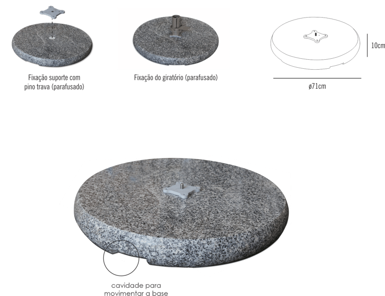 Base em granito e suporte em aço com tratamento anti corrosivo e pintura eletrostática, ideal para ombrelones de grande porte, em locais com incidência de ventos de até 40km/h. Moderna, bonita e funcional, possui quatro cavidades para facilitar o manuseio e transporte. Para maior vida útil e quando for necessária a mudança de local do ombrelone, aconselhamos não arrastar. Limpeza periódica com água e detergente neutro assegura uma melhor aparência e evita o acúmulo de manchas de difícil remoção.
