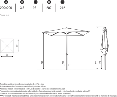 Velocidade máx. de vento admitida com o ombrelone aberto***: 30km/h