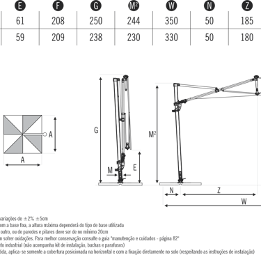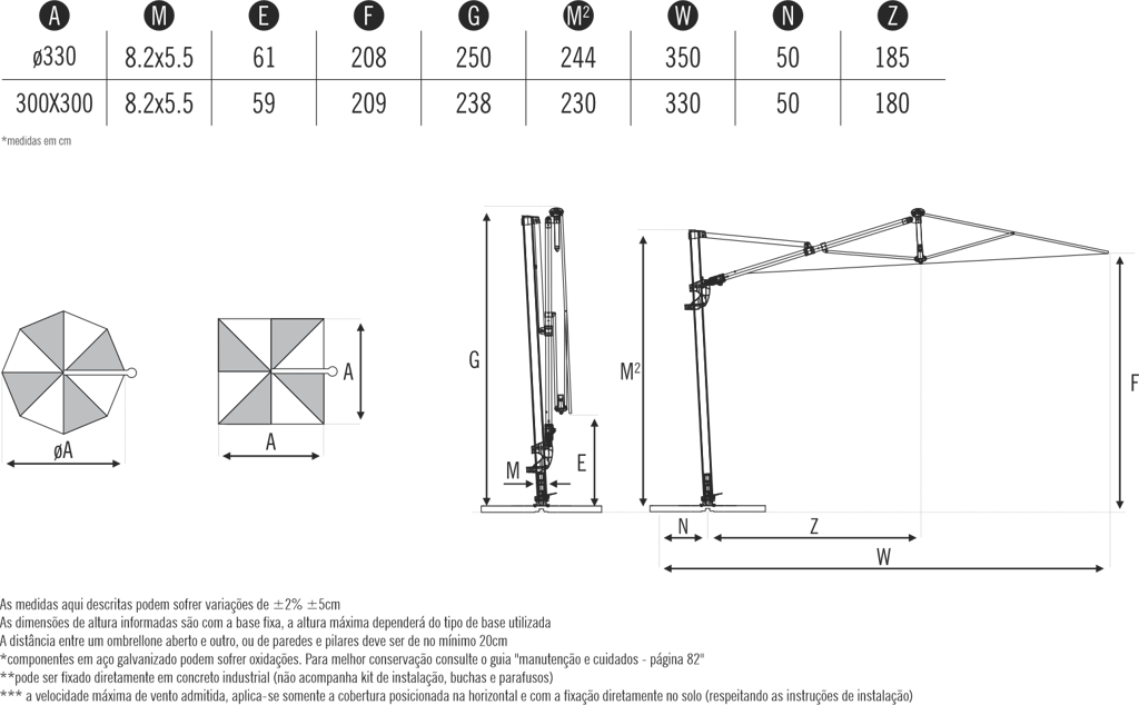 Velocidade máx. de vento admitida com o ombrelone aberto***: 40km/h
