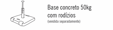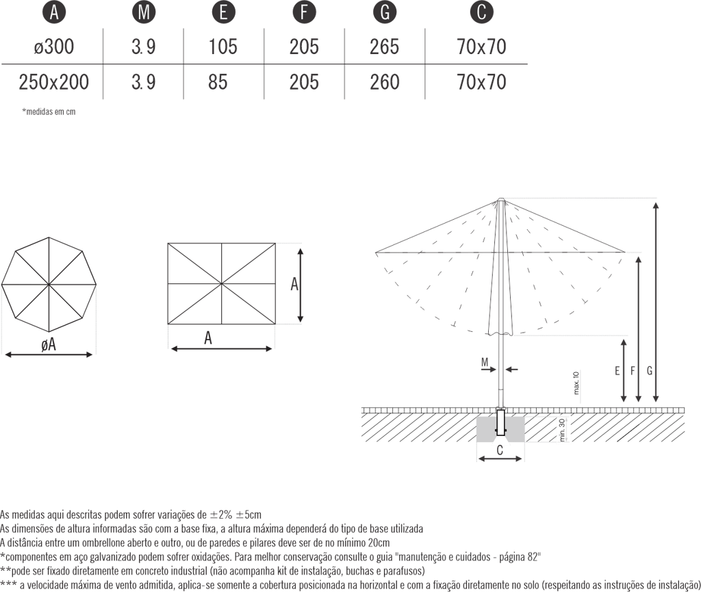 Velocidade máx. de vento admitida com o ombrelone aberto***: 45km/h para o 2,50x2,00m | 50km/h para o ø3,00m