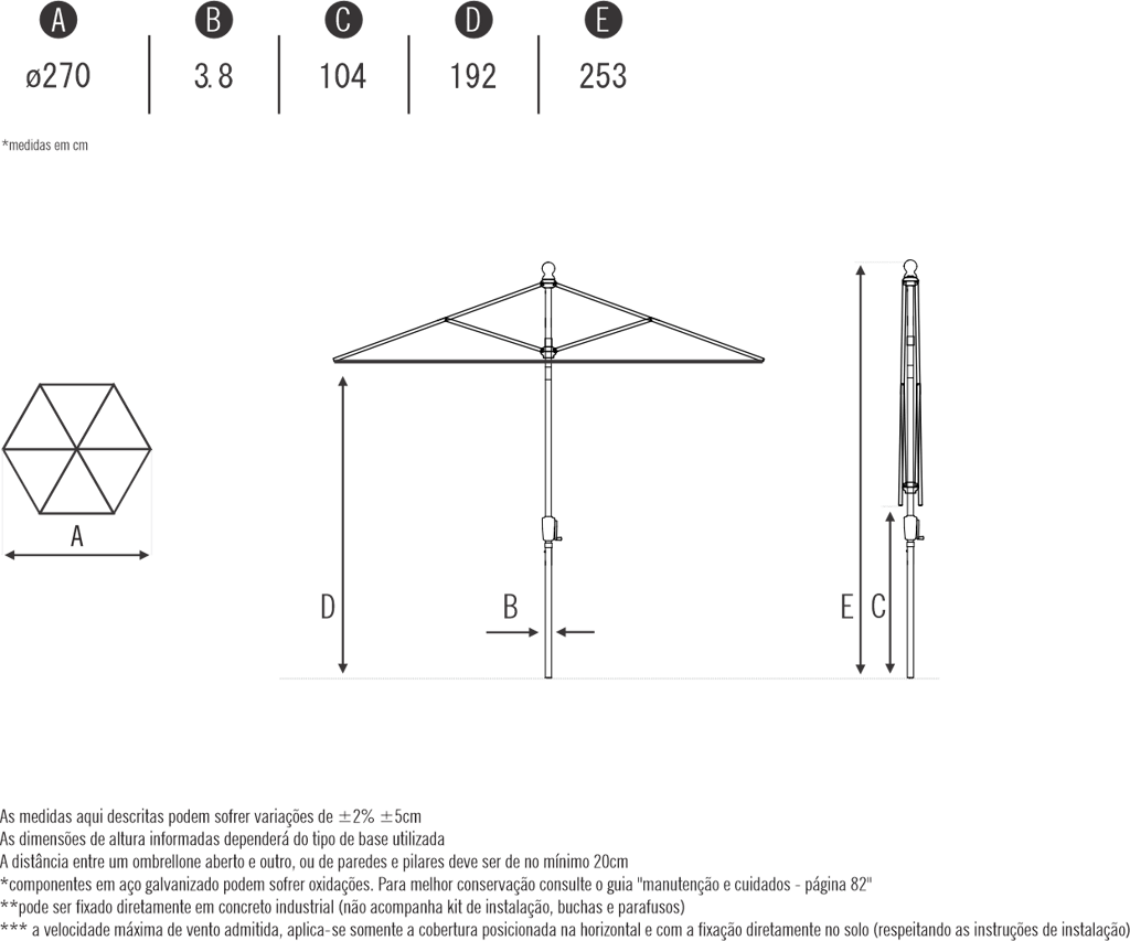 Velocidade máx. de vento admitida com o ombrelone aberto***: 40km/h
