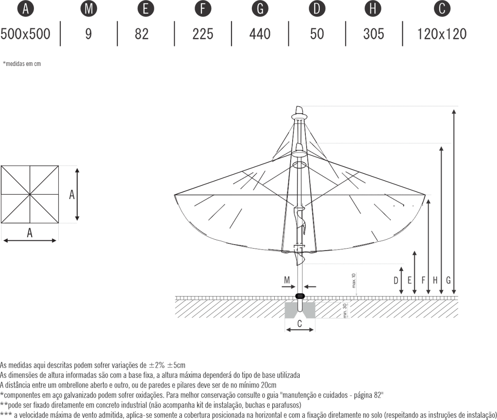 Velocidade máx. de vento admitida com o ombrelone aberto***: 60km/h