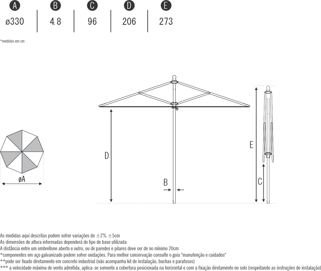 Velocidade máx. de vento admitida: 30km/h (ombrelone aberto)