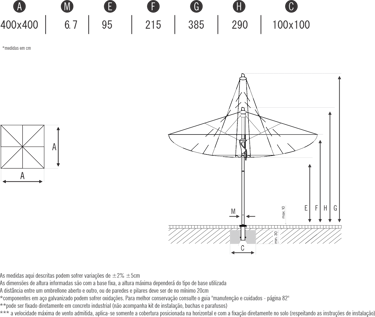 Velocidade máx. de vento admitida com o ombrelone aberto***: 70km/h