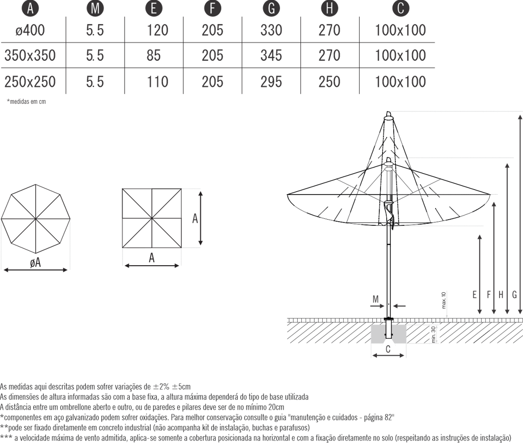 Velocidade máx. de vento admitida com o ombrelone aberto***: 70km/h para o 2,50x2,50m | 50km/h para o 3,50x3,50m e ø4,00m