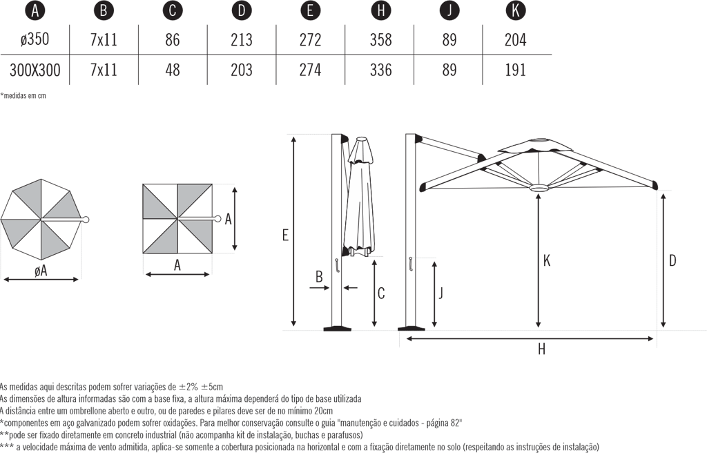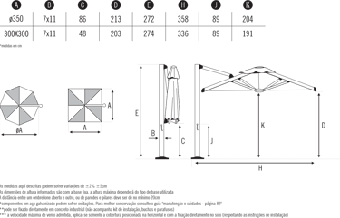 Velocidade máx. de vento admitida com o ombrelone aberto***: 60 km/h