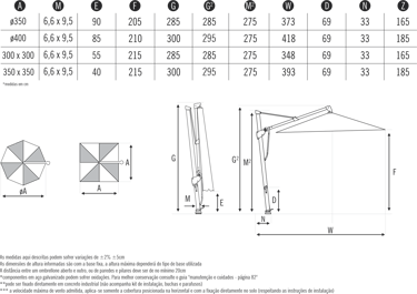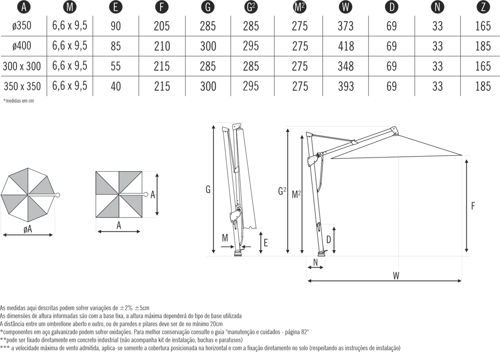 Velocidade máx. de vento admitida com o ombrelone aberto***: 45km/h para o 3,00x3,00m e ø3,50m | 35km/h para o 3,50x3,50m e ø4,00m