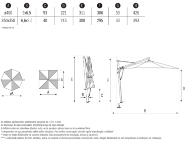 Velocidade máx. de vento admitida com o ombrelone aberto***: 35km/h