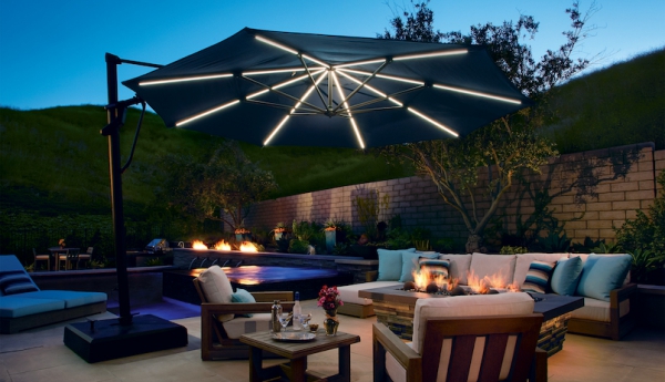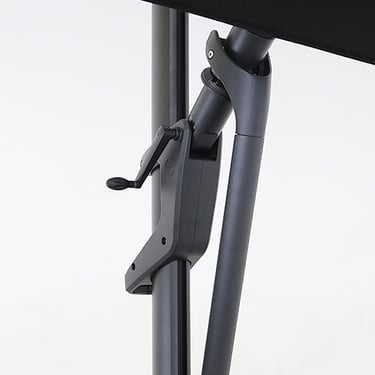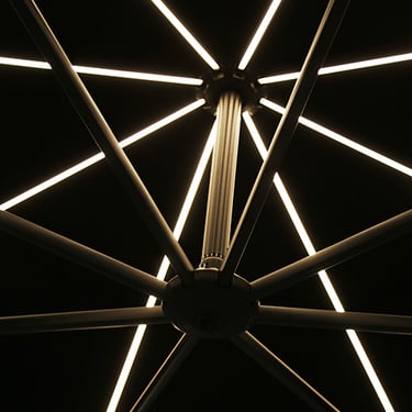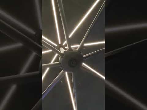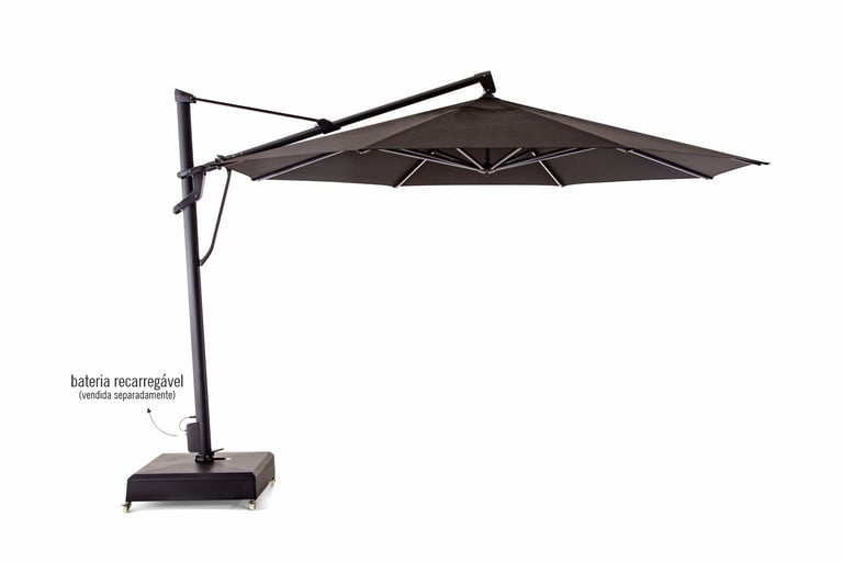 Muito além da proteção solar, o ombrellone de mastro lateral TREASURE GARDEN LED possui versatilidade em sua utilização para o dia e noite por conta de suas 8 varetas em LED com duas regulagens de intensidade (alta e baixa) que proporcionam um ambiente aconchegante e iluminado. O modelo abre e fecha a cobertura por meio de uma manivela e seu sistema de inclinação frontal é através de uma manopla deslizante que permite a movimentação de até 50°. Ele também possui inclinação lateral da cobertura em até 54° dos dois lados, em passos de 18°, e possui rotação 360° por meio de seu pedal giratório. É indicado para grandes espaços residenciais.