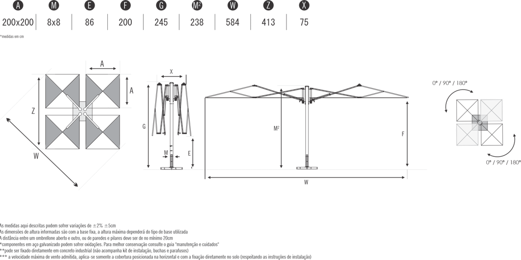 Velocidade máx. de vento admitida: 25 km/h (ombrelone aberto)