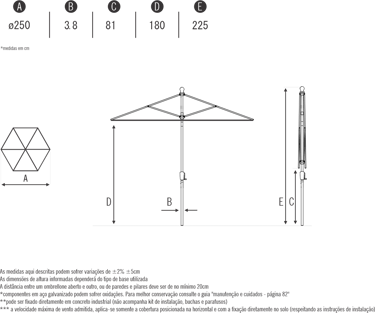 Velocidade máx. de vento admitida com o ombrelone aberto***: 30km/h